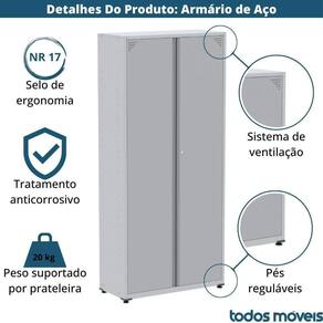 Possui estrutura robusta, fabricada com chapa de aço #26 (0,45 mm) e reforços em aço #20 (0,90 mm), assegurando durabilidade. Com montagem prática, sem parafusos, a instalação é facilitada pelas travas de tecnologia avançada. Para maior segurança, é equipado com fechadura Yale e duas chaves. As prateleiras são ajustáveis, contando com uma fixa e três móveis, reguláveis em altura a cada 50 mm, adaptando-se a diversas necessidades. Com pintura eletrostática e tecnologia de nanotecnologia, possui acabamento anti-corrosivo que resiste ao tempo, atendendo as normas NBR para funcionalidade e estética superior em qualquer ambiente.