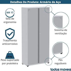 Possui estrutura robusta, fabricada com chapa de aço #26 (0,45 mm) e reforços em aço #20 (0,90 mm), assegurando durabilidade. Com montagem prática, sem parafusos, a instalação é facilitada pelas travas de tecnologia avançada. Para maior segurança, é equipado com fechadura Yale e duas chaves. As prateleiras são ajustáveis, contando com uma fixa e três móveis, reguláveis em altura a cada 50 mm, adaptando-se a diversas necessidades. Com pintura eletrostática e tecnologia de nanotecnologia, possui acabamento anti-corrosivo que resiste ao tempo, atendendo as normas NBR para funcionalidade e estética superior em qualquer ambiente.