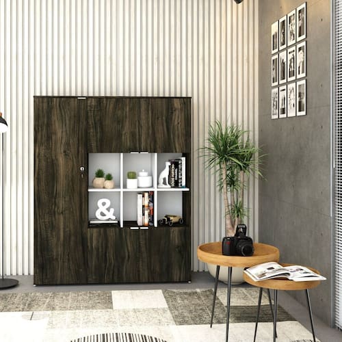 Armário Alto com Nichos WLAN135 WorkLab é uma peça de mobiliário que alia capacidade de armazenamento com um design elegante e moderno, ideal para escritórios que valorizam tanto a funcionalidade quanto a estética. Com nichos centrais abertos e cinco portas, este armário oferece uma solução de armazenamento diversificada, perfeita para exibir itens decorativos ou manter materiais de consulta rápida à mão. Suas portas possuem dobradiças com amortecedor que garantem um fechamento suave e silencioso, além dos puxadores em alumínio, elegantes e funcionais. O Armário WLAN135 WorkLab é mais que um simples móvel de armazenamento, é uma declaração de estilo que traz organização e sofisticação ao ambiente de trabalho.