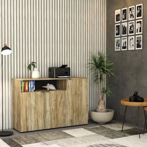 Sobre o ProdutoArmário Aparador C/03 Portas e Nicho 89,5x135x42cm WLAP135 Carvalho / BrancoDescrição do Produto:O Armário Aparador com 03 Portas e Nicho WorkLab é uma peça de mobiliário que combina beleza e funcionalidade, perfeita para complementar qualquer escritório moderno. Com linhas limpas, este aparador oferece amplo espaço interno, enquanto o nicho superior é ideal para guardar itens decorativos ou de fácil acesso. Suas portas possuem dobradiças com amortecedor que garantem um fechamento suave e silencioso, além dos puxadores em alumínio, discretos e funcionais. O Armário Aparador WLAP135 WorkLab é mais do que um simples móvel, é uma peça que valoriza o ambiente de trabalho com sua presença marcante e prá linha WorkLab combina funcionalidade, design contemporâneo e durabilidade para criar um ambiente de trabalho eficiente e inspirador. Com uma ampla variedade de peças versáteis, a WorkLab oferece soluções completas para escritórios, home offices e espaços corporativos. Explore os principais componentes dessa linha e ache a escolha certa para quem busca qualidade, design e funcionalidade em móveis de escritório. Transforme seu espaço de trabalho com a elegância e praticidade da linha Inclusos:1 Armário AparadorDimensões dos Produtos:Armário Aparador C/03 Portas e Nicho 89,5x135x42cm WLAP135 Carvalho / Branco: 135 x 42 x 89,5 cmInformações Logísticas (Comp. X Prof. X Alt.) 156 x 48 x 13,5 cm - Peso: 43,184 KgPeso Total: 43,184 KgObservações:Não acompanha acessórios decorativos. Imagens meramente ilustrativas.Informações Técnicas / Características:- Cor do Produto: Carvalho / Branco- Cor do Predominante: Marrom Claro- Marca: Compace- Modelo: WLAP135- Linha: WorkLab- Material: Mdp - Acabamento: Perffect Acetinado- Escala de Brilho: Fosco- Fita de Borda: Pvc- Possui Portas: 3- Tipo de Porta: Bater- Tipo da Dobradiça: Metálica C/Amortecedor- Possui Gavetas: Não - Possui Chave: Não - Material do Puxador: Alumínio- Possui Prateleiras: 3- Peso Máximo por Prateleira: 10kg - Pés Niveladores: Sim - Acabamento Estrutura: BP- Formato: Retangular- Possui Nicho: 1 - Suporta Até (kg): 70kg- Comprimento: 135cm- Profundidade: 42cm- Altura: 89,5cm - Peso Lí.: 42,125Kg- Recomendações de Uso, Manutenção e Limpeza: Para a limpeza, utilize flanela seca ou pano macio levemente umedecido em água. Utilize um pano seco em seguida. Evite com produtos químicos (solventes, thinner, acetona, etc) e não utilize nenhum tipo de esponja de aço.- Necessita de Montagem: Sim / Acompanha Manual de Montagem- Complexidade da Montagem: Alta: deve ser montado por um montador especializado.- Garantia: 6 meses Quantidade de volumes: 1 | Altura: 89,5 | Comprimento: 135 | Marca: Compace | Modelo: WLAP135 | Necessita montagem: Sim | Quantidade máxima de pedido: 1 | Largura: 42 | Profundidade: 42 Cor: Carvalho / Preto
