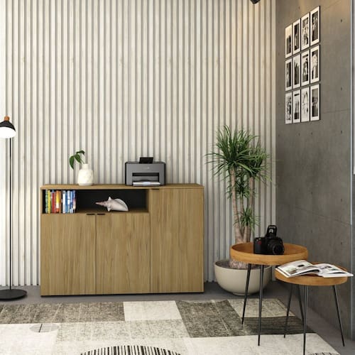 O Armário Aparador com 03 Portas e Nicho WorkLab é uma peça de mobiliário que combina beleza e funcionalidade, perfeita para complementar qualquer escritório moderno. Com linhas limpas, este aparador oferece amplo espaço interno, enquanto o nicho superior é ideal para guardar itens decorativos ou de fácil acesso. Suas portas possuem dobradiças com amortecedor que garantem um fechamento suave e silencioso, além dos puxadores em alumínio, discretos e funcionais. O Armário Aparador WLAP135 WorkLab é mais do que um simples móvel, é uma peça que valoriza o ambiente de trabalho com sua presença marcante e prática. Acabamento da Porta: BP Acabamento da Prateleira: BP Ambiente Principal: Escritório Complexidade da Montagem: Alta: deve ser montado por um montador especializado Cor: Vermont Oak / Preto Cor do Produto: Vermont Oak / Preto Cor Interna: Vermont Oak Escala de Brilho: Fosco Escala de Brilho da Porta: Fosco Escala de Brilho da Prateleira: Fosco Itens Inclusos: 1 Armário Aparador Manual de Montagem e Instalação: https://cdn2.madeiramadeira.com.br/prd/compace-sala-de-jantar/2364778-1727080211-950069-109220.pdf Material da Porta: MDP Material da Prateleira: MDP Material do Puxador da Porta: Alumínio Material Principal: MDP Necessita Montagem: Sim Origem do Produto: Nacional Peso: 42,125 kg Peso Máximo por Prateleira: 10 kg Possui Espelho: Não Possui Nicho: Sim Possui Pés: Não Possui Portas: 03 Possui Prateleiras: 03 Recomendações de Uso, Manutenção e Limpeza: Para a limpeza, utilize flanela seca ou pano macio levemente umedecido em água. Utilize um pano seco em seguida. Evite contato com produtos químicos (solventes, thinner, acetona, etc) e não utilize nenhum tipo de esponja de aço. Sapatas Niveladoras: Sim Sistema de Montagem: Parafuso, Cavilha, Minifix, Dobradiça, Prego e sapata niveladora Suporta Até (kg): 70 kg Tipo de Dobradiça/Corrediça da Porta: Metálica Tipo de Puxador da Porta: Externo Marca: Metalig