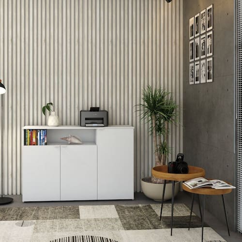 O Armário Aparador com 03 Portas e Nicho WorkLab é uma peça de mobiliário que combina beleza e funcionalidade, perfeita para complementar qualquer escritório moderno. Com linhas limpas, este aparador oferece amplo espaço interno, enquanto o nicho superior é ideal para guardar itens decorativos ou de fácil acesso. Suas portas possuem dobradiças com amortecedor que garantem um fechamento suave e silencioso, além dos puxadores em alumínio, discretos e funcionais. O Armário Aparador WLAP135 WorkLab é mais do que um simples móvel, é uma peça que valoriza o ambiente de trabalho com sua presença marcante e prática. Acabamento da Porta: BP Acetinado Acabamento da Prateleira: BP Acetinado Ambiente Principal: Escritório Complexidade da Montagem: Alta: deve ser montado por um montador especializado Cor: Branco Chess Cor do Produto: Branco Chess Cor Interna: Branco Chess Escala de Brilho: Fosco Escala de Brilho da Porta: Fosco Escala de Brilho da Prateleira: Fosco Itens Inclusos: 1 Armário Aparador Manual de Montagem e Instalação: https://cdn2.madeiramadeira.com.br/atributo/compace-dalex/2357601-1708-17267602119845.pdf Material da Porta: MDP Material da Prateleira: MDP Material do Puxador da Porta: Alumínio Material Principal: MDP Necessita Montagem: Sim Origem do Produto: Nacional Peso: 42,125 kg Peso Máximo por Prateleira: 10 kg Possui Espelho: Não Possui Nicho: Sim Possui Pés: Não Possui Portas: 01 Possui Prateleiras: 03 Recomendações de Uso, Manutenção e Limpeza: Para a limpeza, utilize flanela seca ou pano macio levemente umedecido em água. Utilize um pano seco em seguida. Evite contato com produtos químicos (solventes, thinner, acetona, etc) e não utilize nenhum tipo de esponja de aço. Sapatas Niveladoras: Sim Sistema de Montagem: Parafuso, Cavilha, Minifix, Dobradiça, Prego e sapata niveladora Suporta Até (kg): 70 kg Tipo de Dobradiça/Corrediça da Porta: Metálica Tipo de Puxador da Porta: Externo