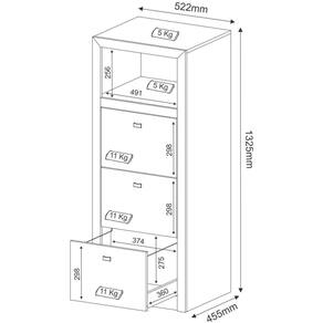 Peso: Peso do Produto: 31,7 kg. Peso suportado: Topo: até 5 Kg | Gavetas: 11 kg.