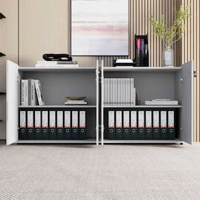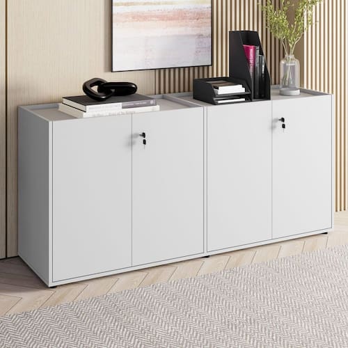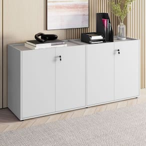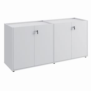 Armário Duplo 4 Portas F5 Office, ideal para organizar materiais e otimizar o espaço com praticidade. Com divisões internas e tampo embutido, une funcionalidade e design moderno para escritórios elegantes e bem organizados.