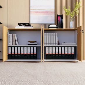 Armário Duplo 4 Portas F5 Office, ideal para organizar materiais e otimizar o espaço com praticidade. Com divisões internas e tampo embutido, une funcionalidade e design moderno para escritórios elegantes e bem organizados.