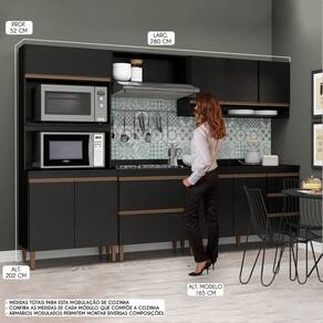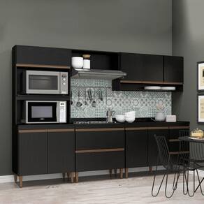 Armário Balcão Sabrina 280x202 Cm 6 Peças Mdp Menu Móveis Preto A Cozinha Modulada Sabrina foi desenvolvida para atender todas as suas necessidades do dia a dia com um design moderno, cheio de atitude, personalidade, funcionalidade, beleza e versatilidade. A Cozinha preta e a tendencia do momento e foi arquitetada com modulos uteis que vao facilitar a sua rotina diaria nos preparos e armazenamento dos utensilios, mantendo sua cozinha sempre organizada. Por se tratar de armarios de cozinha modulados voce pode ajustar os modulos conforme o espaco disponivel e montar diversas modulacoes diferentes para deixar o ambiente muito mais aconchegante. A elegancia fica por conta dos puxadores em perfil e os pes dando um toque unico de sofisticacao. A Cozinha Sabrina e produzida com materiais de excelente qualidade, garantindo a durabilidade e vida util. O melhor em moveis no design atual aliando conforto, qualidade e otimos precos, so na Menu Moveis! Caracteristicas: Produzida em MDP de 15 mm Pintura UV Texturizado Portas com Dobradica Metalica Gavetas com Corredica Telescopica Puxadores Perfil ABS Pes Regulares ABS Balcao para Cooktop possui Tampo com Ranhura que pode ser utilizado com cooktop de 5 bocas, caso nao cortar pode utilizar normalmente. NAO acompanha PIA