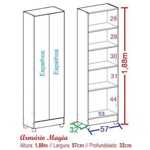 A Sapateira Magia, da Magia Móveis é uma sapateira de uma beleza indescritível, um produto encantador, que vai surpreender você e decorar com perfeição o seu ambiente. Com toda funcionalidade de um armário cheio de prateleiras, ótimo para organizar todos seus sapatos, aliado aos espelhos, que amplificam e sofisticam o ambiente e possibilitam aquela conferida no seu visual, essa sapateira é um item essencial na sua casa.