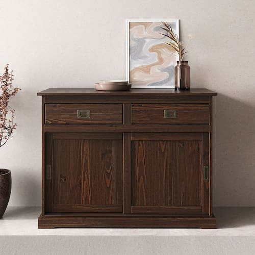 Com portas de correr embutidas que deslizam suavemente, ele oferece praticidade para o dia a dia sem abrir mão do design atemporal. Os puxadores embutidos em metal envelhecido trazem um charme retrô sofisticado, enquanto as linhas retas e robustas reforçam sua presença marcante em qualquer cômodo. As duas gavetas superiores facilitam o armazenamento de itens menores com organização inteligente, e o amplo espaço interno com prateleira permite guardar desde louças até objetos decorativos, com total aproveitamento de cada centímetro.