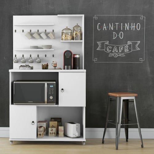 Cantinho do Café Aconchego da Patrimar. Esse móvel é feito para você apaixonado por café, um produto confeccionado e projetado para melhorar o seu dia a dia com muita praticidade sem deixar de lado o charme de poder montar um ambiente único e aconchegante, onde você poderá guardar todas as especiarias e itens necessários para um momento tão importante do seu dia, a hora do café! Características: Tampo de 25 mm Rodízios de silicone Espaços inteligentes 12 Ganchos para xícaras 3 Prateleiras 2 Portas Dimensões: Altura: 15,75 cm Largura: 90 cm Profundidade: 45 cm Peso: 37,64 kg
