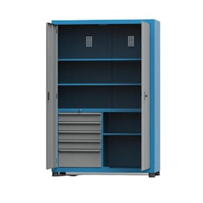 Armário Para Ferramentas com 2 Prateleiras Reguláveis e 1 Fixa, 5 Gavetas é fabricado em chapas de aço carbono resistentes, recebe tratamento de superfície anticorrosivo e finalmente recebe um acabamento de tinta eletrostática a pó. É ideal para quem busca um produto diferenciado no mercado, de alta qualidade e durabilidade!