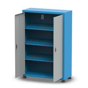 O Armário Porta Cone ISO30 para 108 peças com 3 prateleiras possui pés niveladores e detém uma capacidade de 50kg por prateleira.