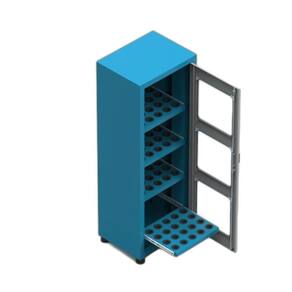 O Armário Porta Cone ISO40 para 80 peças com 4 prateleiras e Visor Acrílico possui pés niveladores e detém uma capacidade de 25kg por prateleira.