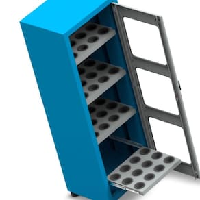 O Armário Porta Cone ISO50 para 48 peças com 4 prateleiras possui pés niveladores e detém uma capacidade de 25kg por prateleira.