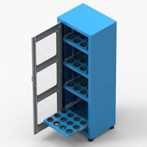 O Armário Porta Cone ISO50 para 48 peças com 4 prateleiras e Visor Acrílico possui pés niveladores e detém uma capacidade de 25kg por prateleira.