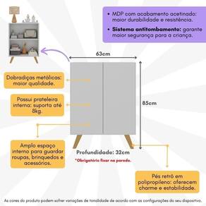 O Armário Cômoda Infantil 2 Portas Retrô Multimóveis MP4231 é a escolha perfeita para organizar o quarto das crianças com estilo e praticidade. Produzido em MDP, possui acabamento acetinado (cerca de 20% de brilho) que agrega sofisticação ao ambiente. Com 2 portas e uma prateleira interna que suporta até 8kg, oferece amplo espaço interno para guardar roupas, brinquedos e outros itens. Além disso,oarmário conta com sistema antitombamento para maior segurança do bebê. Os pés retrô em polipropileno adicionam um charme especial ao móvel, conferindo um visual leve. Proporcione ao seu filho um quarto organizado e charmoso com esta elegante armário cômoda infantil.
