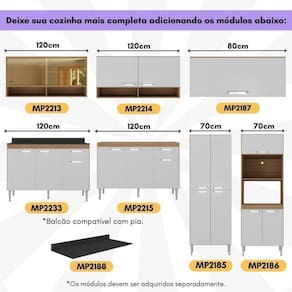 O Armário de Cozinha Compacta Modulada Paris da Multimóveis é uma solução inteligente e elegante para maximizar o espaço na sua cozinha. Este armário é produzi com MDP de 15mm, proporcionando durabilidade e resistência, enquanto seu acabamento acetinado confere um toque de requinte, com cerca de 20% de brilho, enriquecendo o ambiente. O destaque desta cozinha é o armário aéreo de 120cm, que possui portas de correr em vidro reflecta, adicionando um toque moderno à sua cozinha. Além disso, os nichos na parte inferior são perfeitos para acomodar utensílios menores, como temperos, mantendo tudo organizado e ao alcance das mãos. O armário aéreo de 80cm apresenta uma porta basculante equipada com pistão a gás, garantindo abertura suave e fácil acesso ao conteúdo interno. A torre quente é projetada com um compartimento específico para forno e microondas, permitindo que você mantenha esses aparelhos essenciais de cozinha organizados e prontos para uso. A cozinha conta também com um balcão compatível com pia de 120cm (não acompanha tampo), oferecendo um espaço funcional para suas atividades culinárias. A gaveta com corrediças telescópicas proporciona um deslizamento suave e silencioso, facilitando o acesso aos seus utensílios. Os puxadores em ABS com acabamento cromado oferecem uma pegada confortável e durável, enquanto os pés em polipropileno com regulagem de altura garantem estabilidade em qualquer tipo de piso, adaptando-se às suas necessidades específicas. Com um amplo espaço interno em todos os módulos, esta cozinha compacta oferece organização impecável para todos os seus utensílios, ingredientes e acessórios. Os módulos são individuais e permitem montagem conforme a necessidade do ambiente.