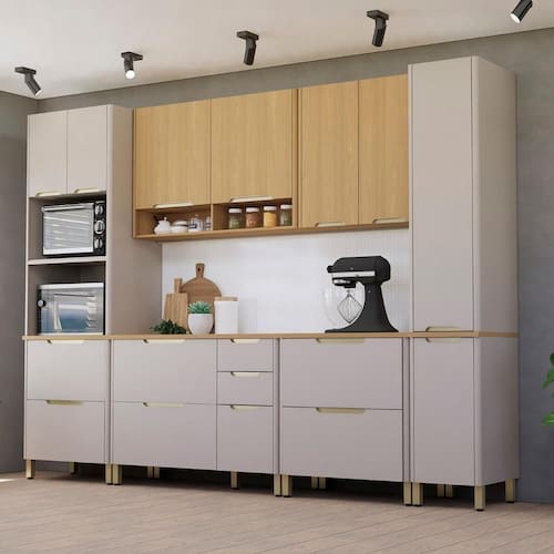 Todos os móveis contam com puxadores que lembram meia-lua, trazendo um toque contemporâneo e funcional para a sua Cozinha. Os balcões e paneleiros possuem pés com regulagem de altura, permitindo melhor adaptação ao ambiente.