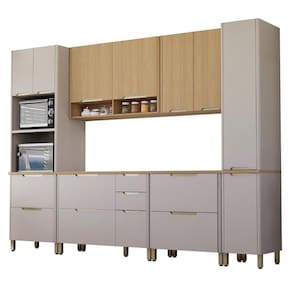 O Armário de Cozinha alia sofisticação e funcionalidade, com peças de cantos arredondados que oferecem um visual elegante. Conta com dois Paneleiros, um com três portas, sendo uma basculante com pistão a gás e uma gaveta com corrediças invisíveis. Sua montagem é versátil, permitindo a inclusão de dois ou três nichos conforme a necessidade. O outro tem quatro prateleiras internas, ideal para manter tudo no lugar. Ambos possuem portas com dobradiças metálicas com amortecimento, garantindo um fechamento suave.