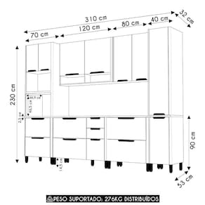 Peso Suportado Distribuído: Paneleiros 155kg/ Balcões 61kg/ Aéreos 45kg/ Tampo 15kg.