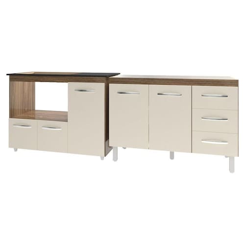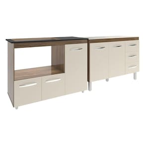 Armário Cozinha Balcão Gabinete De Pia 120 Cm Bruna E Balcão Alana Para Fogão Cooktop 5 Bocas E Forno Savana Off White O Kit Balcão para Pia 118 cm Bruna e Balcão para Cooktop 5 Bocas Alana trazem a combinação perfeita de sofisticação e funcionalidade para a sua cozinha. Com um design moderno e elegante, este conjunto é ideal para quem deseja praticidade e beleza no ambiente culinário. Características do Balcão de Pia Bruna 118 cm: Altura: 83,5 cm (com pés) | 69 cm (sem pés) Largura: 118 cm (ideal para pia de 120 cm) Profundidade: 50 cm Material: MDP (madeira) Portas: 2 Gavetas: 3 Prateleiras: 1 Puxadores: 5 plásticos cromados Pés: 5 reguláveis de plástico (altura: 16,5 cm, ajustáveis até 18 cm) Corrediças: Metálicas Acompanha tampo: Não Indicações de Uso: Cozinha