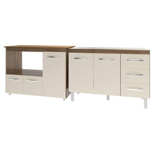 Características do Kit Montado: Largura Total: 232 cm (lado a lado dos dois balcões) Profundidade: 50 cm Altura Total: 85,5 cm (com tampo do balcão para micro-ondas e forno)
