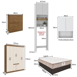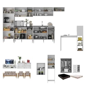 - Produto Composto por: 1 armário de cozinha com bancada, 1 rack, 1 aparador, 1 sofá 3 lugares, 2 poltronas, 1 armário aéreo 2 portas, 1 armário para vaso sanitário, 1 guarda-roupas, 1 cômoda, 1 cama box com colchão, manual de montagem e kit ferragem.
