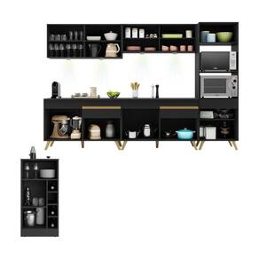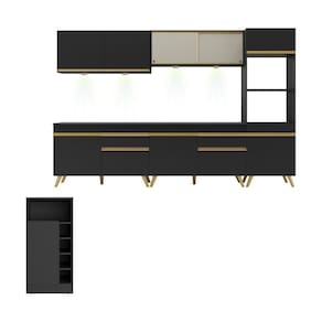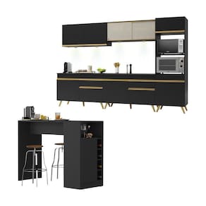 Armário De Cozinha Completa Com Bancada Americana Veneza Multimóveis Mp2199 Preto/dourado Preto/dourado O Armário de Cozinha Completa com Bancada Americana Veneza Multimóveis MP2199 é produzido em MDP com acabamento acetinado (cerca de 20% de brilho), garantindo durabilidade. Com 5 portas de giro, 2 portas de correr em vidro reflecta, 3 portas basculantes, 2 gavetas com corrediças metálicas (mais leveza no manuseio), módulo para forno e micro-ondas, além de compartimento para utensílios mais altos, a cozinha oferece amplo espaço interno e praticidade no acesso aos utensílios. Além disso, possui puxadores em ABS e pés retrô em polipropileno que adicionam um toque estiloso ao ambiente. Os tampos de 15mm dos balcões e da bancada são resistentes. Os módulos individuais permitem flexibilidade na montagem. Os balcões possuem tampos removíveis (compatíveis com pia de 120cm). Com luminárias em LED que funcionam com 3 pilhas AAA, esta cozinha oferece uma iluminação brilhante para facilitar as atividades diárias. Versátil, a bancada conta com 1 porta, prateleira interna e adega embutida, o que facilita na hora de servir bebidas às suas visitas, além de poder ser utilizada também como divisora de ambientes. Este conjunto é uma ótima opção para tornar o ambiente gastronômico completo e funcional! Conteúdo da Embalagem: 1 (um) Armário Aéreo 120cm 1 (um) Armário Aéreo com Portas de Vidro 120cm 2 (dois) Balcões com Tampo 120cm 1 (um) Armário para Forno e Micro-Ondas 62cm 1 (um) Kit com 4 Luminárias LED 1 (uma) Bancada/Mesa Manual de Montagem Kit Ferragem