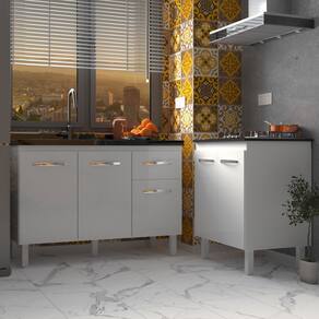 Altura: 83,5 cm (com os pés), 67 cm (sem os pés) Largura: 118 cm (padrão para pia de 120 cm) Profundidade: 50 cm Material: MDP (madeira) Portas: 3 portas Gavetas: 1 gaveta Prateleiras: 1 prateleira Puxadores: 4 puxadores plásticos cromados Pés: 5 pés reguláveis de plástico (altura dos pés: 16,5 cm; regulagem para nivelamento até 18 cm) Corrediças: Metálicas Acompanha tampo: Não