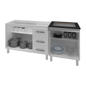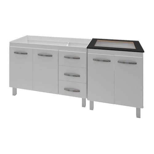 Armário Cozinha Gabinete Pia De 120 Cm Bianca Com Balcão Cooktop 4 Bocas Branco Jade O conjunto Balcão Gabinete para pia de cozinha Bianca e Balcão para Cooktop Jade é um conjunto indispensável em sua cozinha onde a praticidade e ergonomia andam lado a lado, são cores sofisticadas e com nova forma de montagem bem mais pratica, adaptando as suas necessidades e de sua cozinha, são diversos modelos para lhe atender, conheça você também nossa linha. Características Balcão de Pia Bianca 118 cm: Altura:83,5 cm (Com os Pés). Altura sem os pés: 67 cm. Largura: 118 cm (Padrão para pia de 120 cm). Profundidade: 50 cm. Material: MDP (madeira). Portas: 2 Portas. Gavetas: 3 Gavetas. Prateleiras: 1 Prateleira. Puxadores: 5 puxadores plásticos cromados Pés: 5 pés reguláveis de plástico. Altura dos pés:16,5 cm Regulagem dos pés: Somente para nivelamento, (Chega no máximo a 18 cm). Corrediças: Metálicas. Acompanha tampo: Não