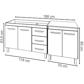 Características do kit montado: Largura 188 cm (lado a lado os dois balcões). Profundidade 53 cm (Profundidade do balcão para cooktop com tampo, sem tampo os balcões possuem 50 cm de profundidade.) Altura: 85 cm (Altura do balcão para cooktop com tampo, sem tampo os balcões possuem 83,5 cm de altura.)