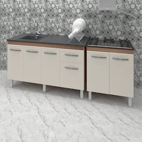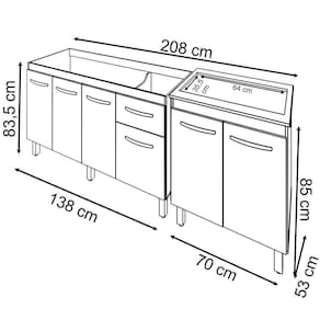 Características do kit montado: Largura 208 cm (lado a lado os dois balcões). Profundidade 53 cm (Profundidade do balcão para cooktop com tampo, sem tampo os balcões possuem 50 cm de profundidade.) Altura: 85 cm (Altura do balcão para cooktop com tampo, sem tampo os balcões possuem 83,5 cm de altura.)