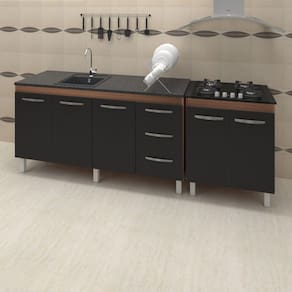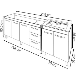 Você já conhece o Kit Balcão Para Pia de 140 cm Carina com Balcão para Cooktop Jade 4 bocas? Não? Você não sabe o que está perdendo! Este kit foi feito para a sua cozinha, desenvolvido em MDP de alta qualidade, com pintura UV ele é bonito, tem um design exclusivo, que vai encaixar perfeitamente na sua necessidade, adquira já o seu! Características Balcão de Pia Carina 138 cm:Altura:83,5 cm (Com os Pés).Altura sem os pés: 67 cm.Largura: 138 cm.Profundidade: 50 cm.Material: MDP (madeira).Portas: 2 Portas.Gavetas: 3 Gavetas.Prateleiras: 1 Prateleira.Puxadores: 5 puxadores plásticos cromadosPés: 5 pés reguláveis de plástico.Altura dos pés:16,5 cmRegulagem dos pés: Somente para nivelamento, (Chega no máximo a 18 cm).Corrediças: Metálicas.Indicações de Uso: Cozinha Acompanha tampo: Não Características Balcão Para Cooktop Jade 4 Bocas: Altura: 85 cm (Altura do produto com os pés e com o tampo) Altura sem os pés: 68,5 cm Largura: 70 cm Profundidade: 53 cm *A largura 70 cm e Profundidade 53 cm correspondem ao tampo do balcão, sem o tampo o balcão tem 68 cm de Largura e 50 cm de profundidade (mesma profundidade do balcão de pia). Dimensões do Nicho (Recorte para encaixar o cooktop): 53 x 36 cm Material: MDP Portas: 2 Portas Prateleiras: 1 prateleira (Opcional) Puxadores: 2 puxadores plásticos cromados Pés: 4 pés reguláveis de plástico. Altura dos pés: 16,5 cm Regulagem dos pés: Somente para nivelamento, (Chega no máximo a 18 cm). Acompanha tampo: Sim Características do kit montado: Largura 208 cm (lado a lado os dois balcões). Profundidade 53 cm (Profundidade do balcão para cooktop com tampo, sem tampo os balcões possuem 50 cm de profundidade.) Altura: 85 cm (Altura do balcão para cooktop com tampo, sem tampo os balcões possuem 83,5 cm de altura.) *Os Móveis não são acoplados, são montados individualmente e podem ser utilizados em locais diferentes. *Imagem meramente ilustrativa, não acompanha objetos decorativos, é somente os dois balcões.