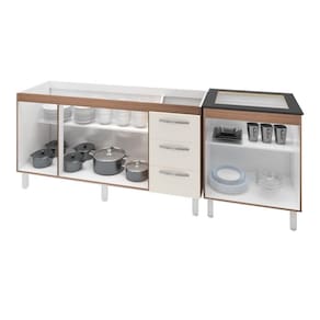 Características do kit montado: Largura 218 cm (lado a lado os dois balcões). Profundidade 53 cm (Profundidade do balcão para cooktop com tampo, sem tampo os balcões possuem 50 cm de profundidade.) Altura: 85 cm (Altura do balcão para cooktop com tampo, sem tampo os balcões possuem 83,5 cm de altura.) *Os Móveis não são acoplados, são montados individualmente e podem ser utilizados em locais diferentes. *Imagem meramente ilustrativa, não acompanha objetos decorativos, é somente os dois balcões.
