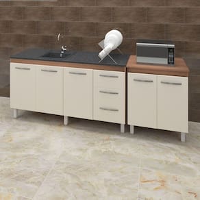 Armário Cozinha Gabinete Pia De 150 Cm Diana Com Balcão Multiuso Micro-ondas Savana Frente Off-white Serena O Kit Balcão para pia de 150 cm Diana com Balcão Multiuso para Micro-ondas ou Forno Serena vai trazer para a sua casa praticidade, elegância e tornar a sua cozinha um ambiente ainda mais especial. Por serem móveis da mesma linha, eles combinam, deixam o ambiente harmônico, diferenciado e ainda mais atraente! A sua cozinha merece este lindo kit da Moblis Móveis, adquira já o seu! Características: Altura:83,5 cm (Com os Pés). Altura sem os pés: 67 cm. Largura: 148 cm (Padrão para pia de 150 cm). Profundidade: 50 cm. Material: MDP (madeira). Portas: 3 Portas. Gavetas: 3 Gavetas. Prateleiras: 1 Prateleira. Puxadores: 6 puxadores plásticos cromados Pés: 6 pés reguláveis de plástico. Altura dos pés:16,5 cm Regulagem dos pés: Somente para nivelamento, (Chega no máximo a 18 cm). Corrediças: Metálicas. Indicações de Uso: Cozinha *Imagem meramente ilustrativa, Não acompanha tampo ou pia nem objetos decorativos, é somente o balcão.