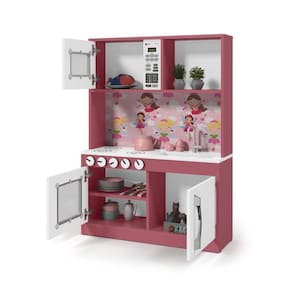 Armário Cozinha Infantil Lux Branco Rosa O Armário Cozinha Infantil possui Dobradiças com amortecedores (evita acidentes) e Acabamento em alto brilho e puxadorores cromados em plástico.