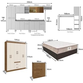 Conteúdo da Embalagem: 1 (um) Armário de cozinha 1 (uma) Bancada. 1 (um) Rack 1 (um) Aparador 2 (dois) Guarda-roupas 2 (duas) Cômodas 1 (uma) Cama box casal com colchão 1 (uma) Bicama com colchões 1 (um) Berço com colchão 1 (um) Guarda-roupa infantil 1 (uma) Cômoda infantil Kit Ferragem Manual de Montagem