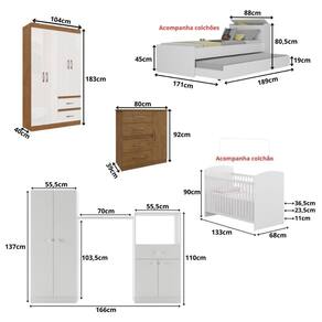 Quarto Infantil: -Berço produzido em MDP com acabamento acetinado. -Padrão nacional com grade fixa e suporte para mosquiteiro. -Lastro do colchão com 3 regulagens de altura. -Acompanha cômoda e guarda-roupa para o bebê, sendo módulos individuais. -Colchão D18 inlcuso (130x60cm) com tratamento anti-ácaro e anti-alérgico. Certificados pelo Inmetro.