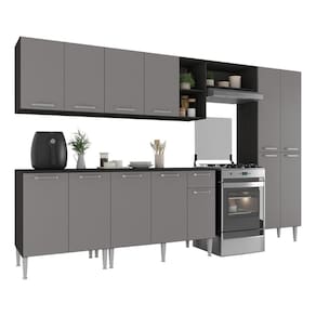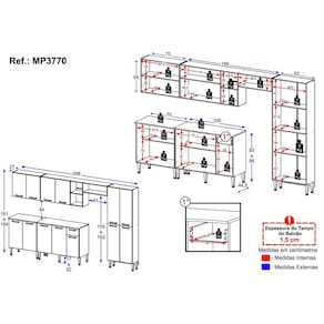 Diferenciais: - 3 anos de garantia contra defeitos de fabricação e material. - Produzida em madeira de reflorestamento (MDP 12/15mm): garante resistência e durabilidade. - Acabamento acetinado com cerca de 20% de brilho: visual sofisticado e facilidade na limpeza. - As opções de cor Preto/Lacca Fumê e Branco/Lacca Fumê possuem frentes com acabamento brilhante. - Composta por 5 módulos individuais, permitindo melhor adaptação ao seu espaço (nicho para fogão/geladeira é anexo ao aéreo). - Balcão com tampo de 15mm (compatível apenas com pia sob medida devido à profundidade). - Prateleiras internas e nichos externos que facilitam a organização de utensílios, mantimentos e eletros. - 13 portas com dobradiças metálicas: oferecem amplo espaço interno. - Compartimentos para armazenar utensílios mais altos com praticidade. - 1 gaveta com corrediças metálicas: ideal para talheres e itens de uso diário. - Espaço dedicado para fogão ou geladeira: otimiza o espaço do ambiente. - Puxadores em ABS com acabamento cromado: práticos e confortáveis ao manuseio. - Pés em polipropileno com regulagem de altura de 17 a 20cm: permitem um perfeito nivelamento aos módulos.