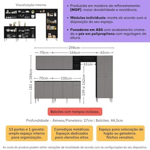 Dimensões do Produto Montado: Altura: 181 a 184cm | Largura: 298cm | Profundidade: 44,5cm (Balcões) - 27cm (Aéreos) *Espaço para Fogão/Geladeira - Altura: 159 a 162cm | Largura: 61cm *Você pode consultar as medidas detalhadas na imagem técnica do produto.