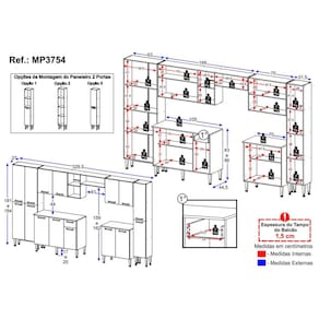 Dimensões do Produto Montado: Altura: 181 a 184cm | Largura: 329,5cm | Profundidade: 44,5cm (Balcões) - 27cm (Aéreos) *Espaço para Fogão/Geladeira - Altura: 159 a 162cm | Largura: 61cm *Você pode consultar as medidas detalhadas na imagem técnica do produto.