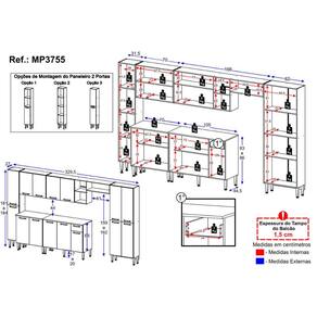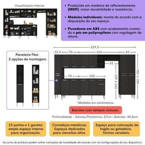 Dimensões do Produto Montado: Altura: 181 a 184cm | Largura: 329,5cm | Profundidade: 44,5cm (Balcões) - 27cm (Aéreos) *Espaço para Fogão/Geladeira - Altura: 159 a 162cm | Largura: 61cm *Você pode consultar as medidas detalhadas na imagem técnica do produto.
