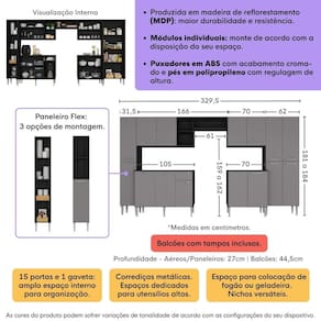 Dimensões do Produto Montado: Altura: 181 a 184cm | Largura: 329,5cm | Profundidade: 44,5cm (Balcões) - 27cm (Aéreos) *Espaço para Fogão/Geladeira - Altura: 159 a 162cm | Largura: 61cm *Você pode consultar as medidas detalhadas na imagem técnica do produto.