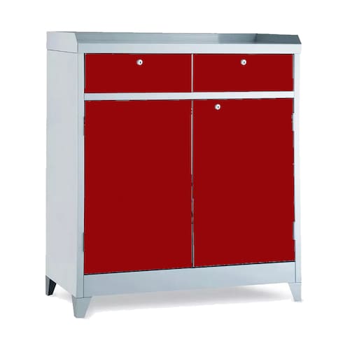 Armario de aço ferramenteiro duplo, este armário em aço armazena ferramentas de maneira versátil e segura, contando com fechadura frontal. Prático e extremamente resistente, possui 2 portas com 1 prateleira interna com capacidade de 50kg e duas gaveta com puxador. Produzido em Aço de alta qualidade em chapa 26, com tratamento anti-ferruginoso. O acabamento em sistema de pintura eletrostática a alta temperatura a pó (epóxi) também garante maior durabilidade da cor e resistência à ferrugem.
