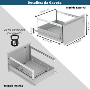 O acabamento do produto é de alta qualidade, com tratamento anticorrosivo por nanotecnologia, garantindo maior resistência à corrosão e durabilidade prolongada. A pintura eletrostática a pó, com uma camada de 30 a 40 mícrons e secagem em estufa a 240C, assegura proteção uniforme e durável contra desgastes. Cada gaveta é projetada para suportar até 25 kg de peso distribuído uniformemente, proporcionando uma capacidade de armazenamento de 30 a 40 pastas suspensas por gaveta, garantindo e eficiência no uso contínuo.