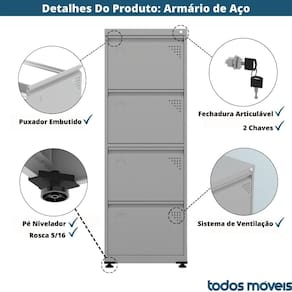 Material e Estrutura: Fabricado em chapa de aço normatizada, com laterais, fundos e frentes de gavetas em chapa #26 (0,45mm) e parte superior em chapa #24 (0,60mm), garantindo robustez e confiabilidade.