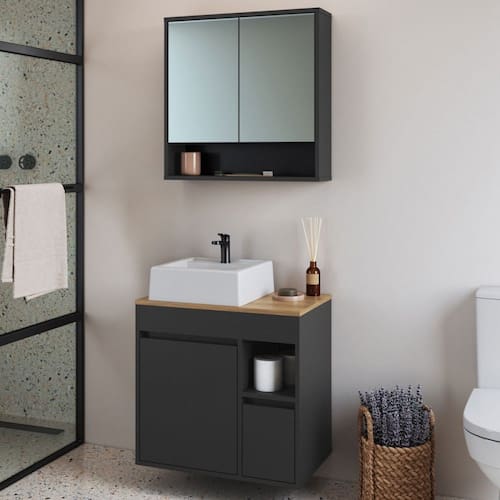 O(a) Armário de Banheiro Bangladesh 3 Portas 1 Gaveta com Cuba e com Espelho Grafite - Art In Móveis é produzido em MDP na escala de brilho Fosco, e possui um grau de dificuldade de montagem: Médio.
