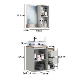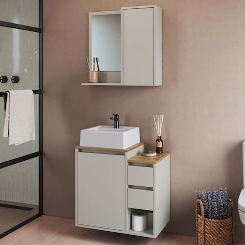 O(a) Armário de Banheiro Bari 2 Portas 2 Gavetas com Cuba e Espelho Arenas - Art In Móveis é produzido em MDP na escala de brilho Fosco, e possui um grau de dificuldade de montagem: Médio.