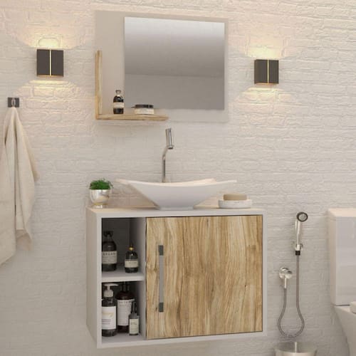 O(a) Armário de Banheiro com Cuba e Espelho 1 Porta 2 Prateleiras Branco Chess/Carvalho 13689 - Compace é produzido em MDP na escala de brilho Fosco, e possui um grau de dificuldade de montagem: Médio.