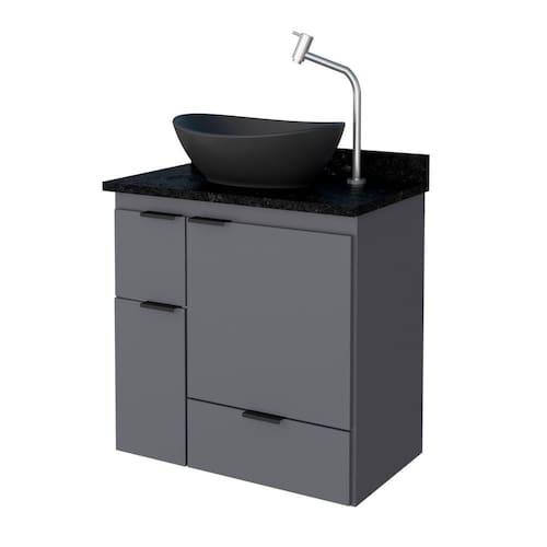 Estrutura em Madeira. Possui 1 portas, 1 prateleira, lávatorio em mármore sintético com borda sobreposta.