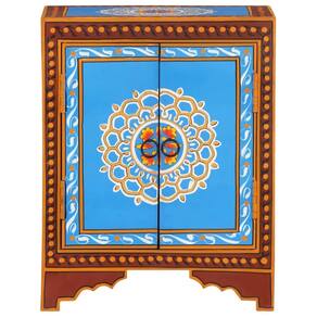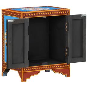 Esta mesa de cabeceira é feita de madeira maciça de manga, uma madeira tropical. Ele tem a força para suportar o peso e também suportar o desgaste do tempo. Além disso, o artesanato requintado e os belos grãos de madeira tornam cada peça um pouco diferente da outra. O armário lateral de madeira tem um tampo resistente, no qual você pode colocar uma lâmpada de cabeceira, despertador ou qualquer outra coisa que você possa precisar perto de sua cama. Há um amplo espaço dentro de duas portas para manter todos os tipos de itens menores organizados e ao alcance. Os ricos detalhes decorativos pintados à mão fazem dele uma bela decoração para o seu interior